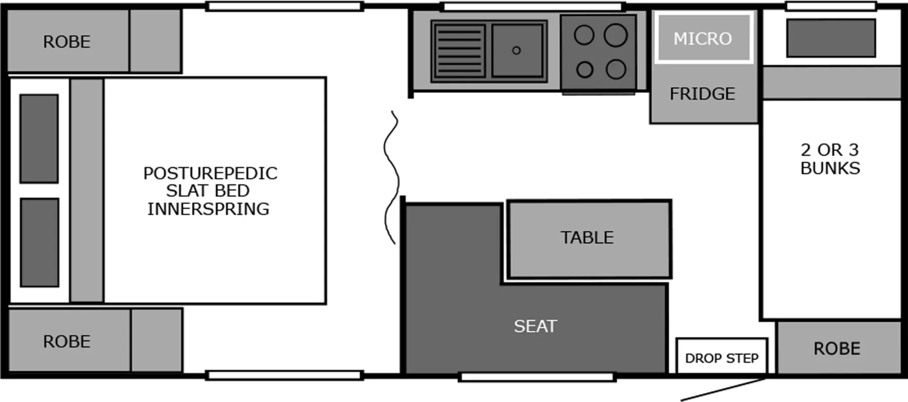 With 2 or 3 bunks, a large kitchen, and an L-shaped dinette, this van is designed to delight any young family just starting their caravanning adventure.